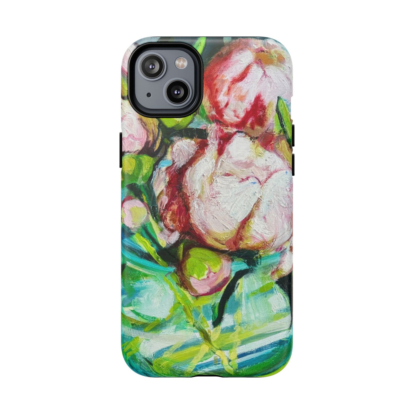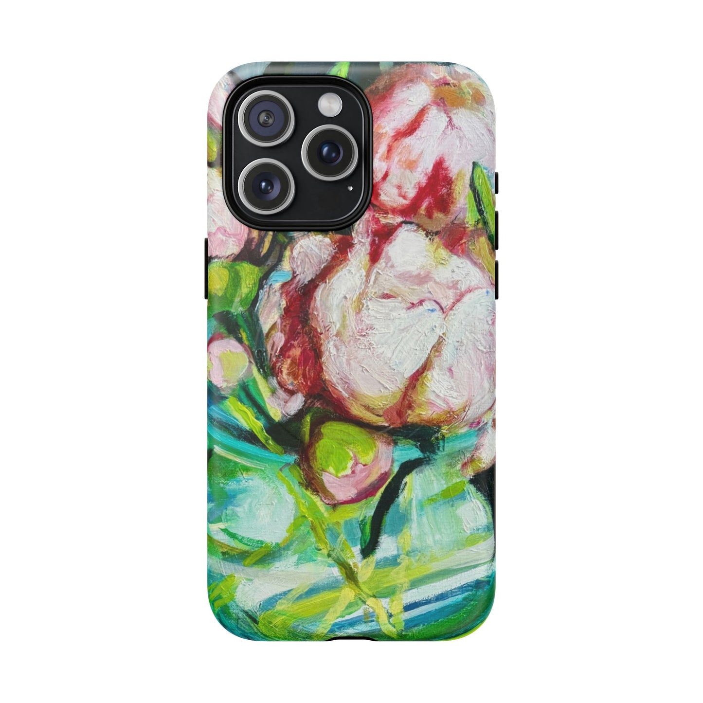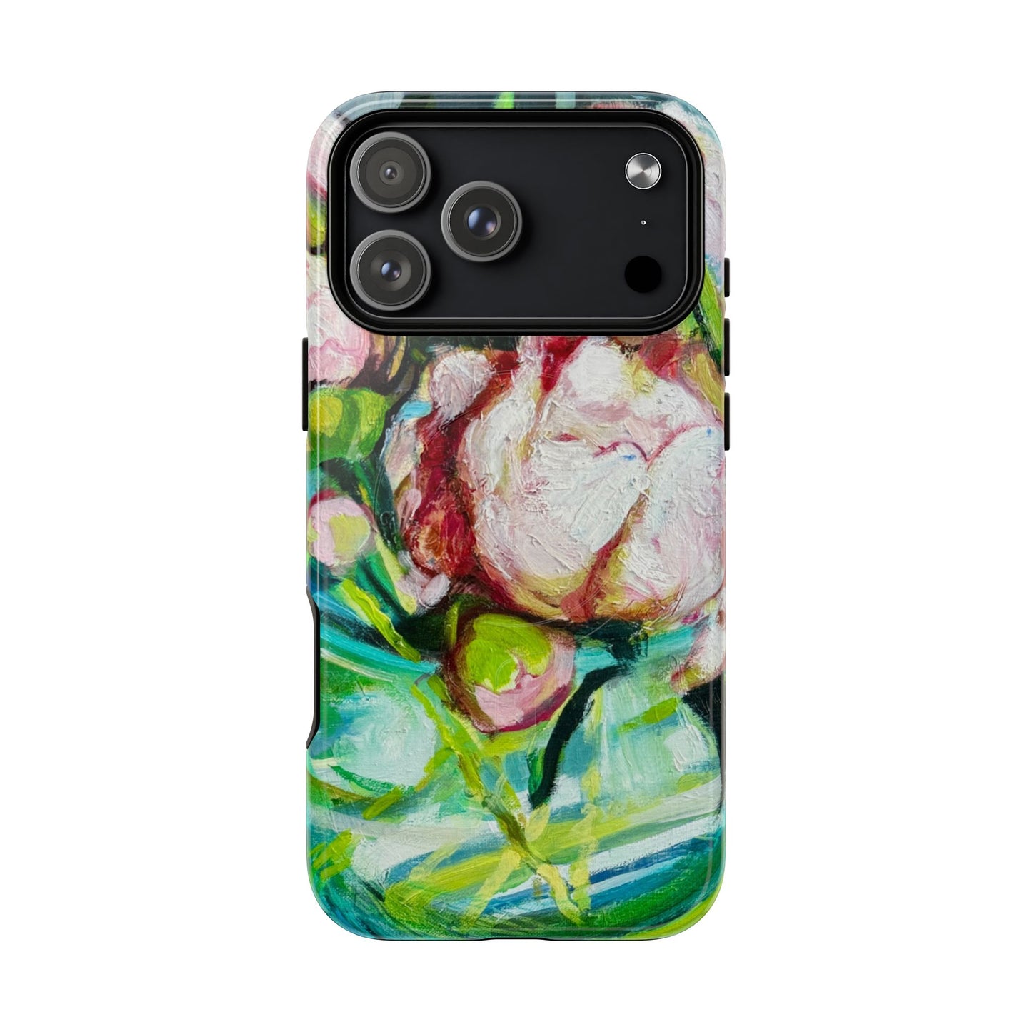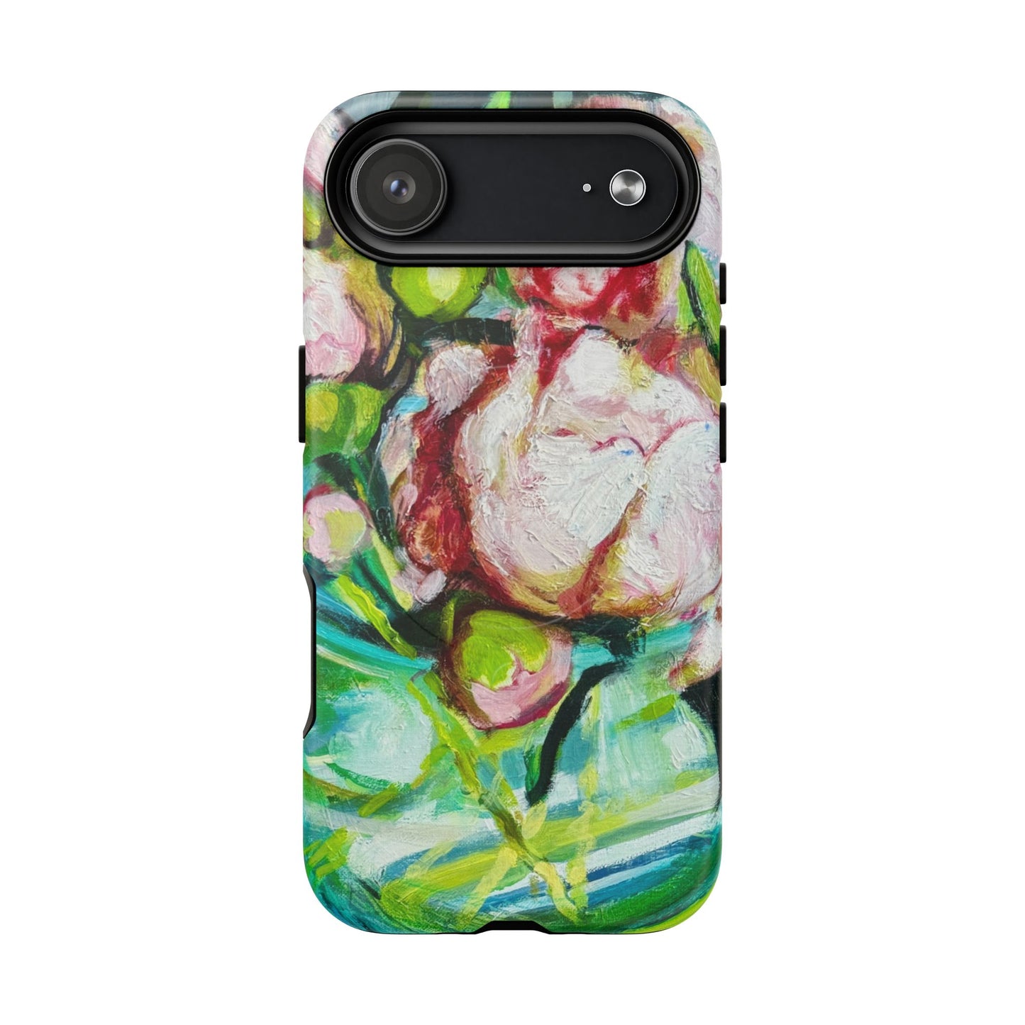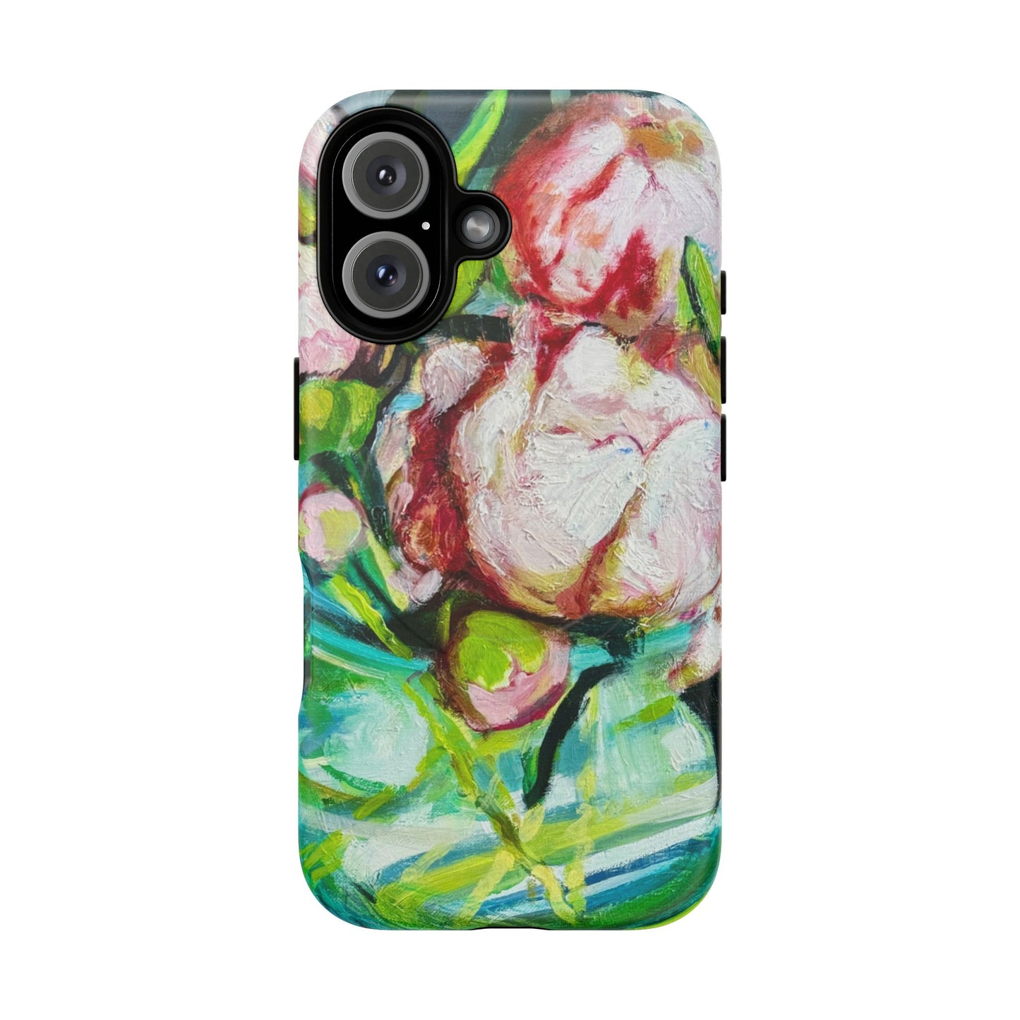 A vibrant, painterly phone case that turns your device into a small canvas. Thick brushstrokes of blush, green and teal blend into an impressionistic floral composition that feels alive to the touch. The dual-layer shell and soft TPU liner cushion against drops while the full-wrap print keeps the artwork seamless around edges. Magnetic compatibility means it snaps cleanly to MagSafe accessories, and open ports preserve everyday function. This case is for people who carry color and hand-painted texture with them — a wearable accent that brightens commutes, coffee runs, and quiet mornings at the studio.