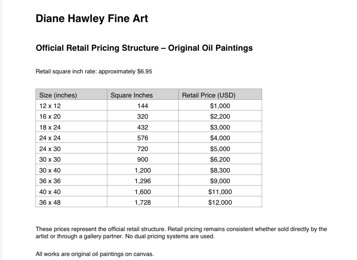 Each original oil painting is priced using a consistent square-inch structure, so you can easily understand how size influences the value of a piece. This ensures transparency and consistency, whether you are purchasing directly from Diane or through a gallery.